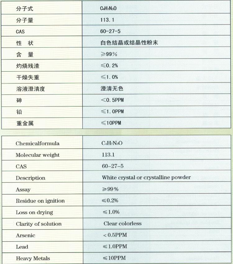 2.將水合肌酸、濃鹽酸和水加熱,熱濾后冷卻,加入氨水,濾出肌酐晶體,經(jīng)洗滌處理,即得純品肌酐。